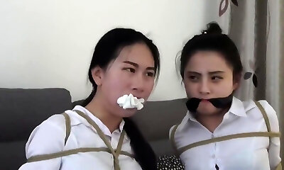 Chinese secretaries in white t-shirts are thoroughly gagged
